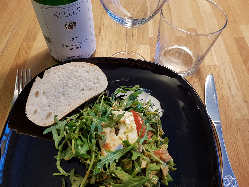 I think the first time that I, at least consciously, discovered the Silvaner grape was on a Lufthansa flight from Düsseldorf to New York back in 2009. I can still remember the crisp taste as I was having lunch looking down on the Scottish Highlands. Recreating a Lufthansa appetizer favourite with oven-roasted tomatoes, the Keller Grüner Silvaner turns out to be a good match with a taste of white flowers, peach and citrus that blasts out of the glass and puts me right back there high above the blue Atlantic.